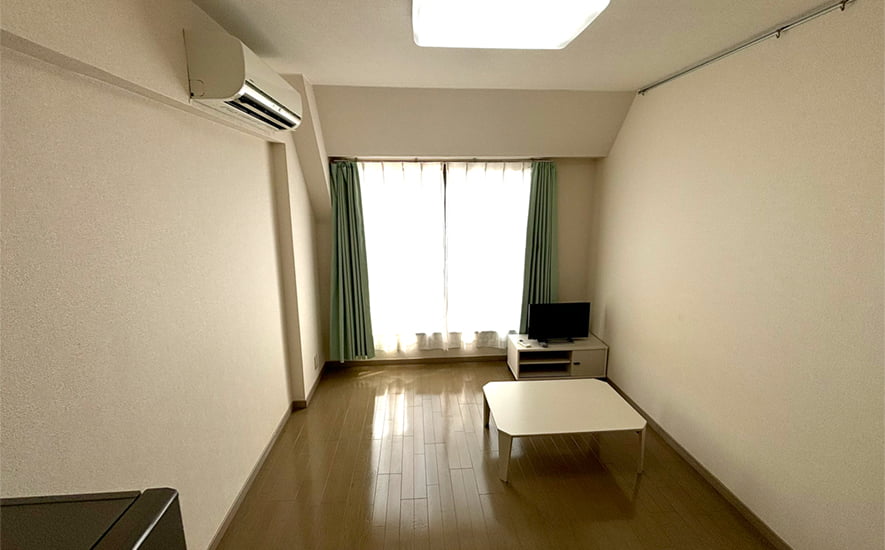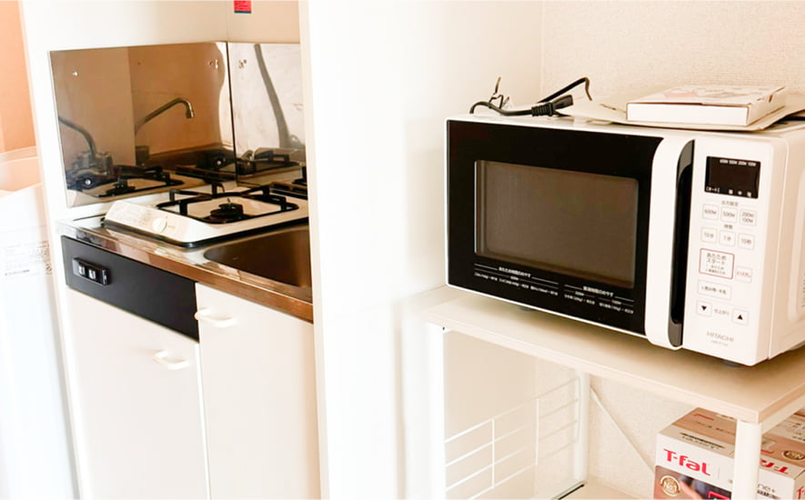 エアコン / ネット回線 / テレビ / 電子レンジ / 電気ケトル / 掃除機 / ハンガーラック / ミニテーブル / 収納棚 設置済