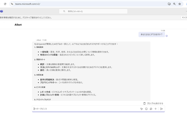 マイクロソフト社のコミュニケーションツールのTeams内で利用出来る、ChatボットをChatGPTと連動させて、Teams内のチャットとして対話型で利用する事が可能。知りたい情報をTeams内でチャット相手に質問するように利用可能なため、気軽に利用する事が可能。